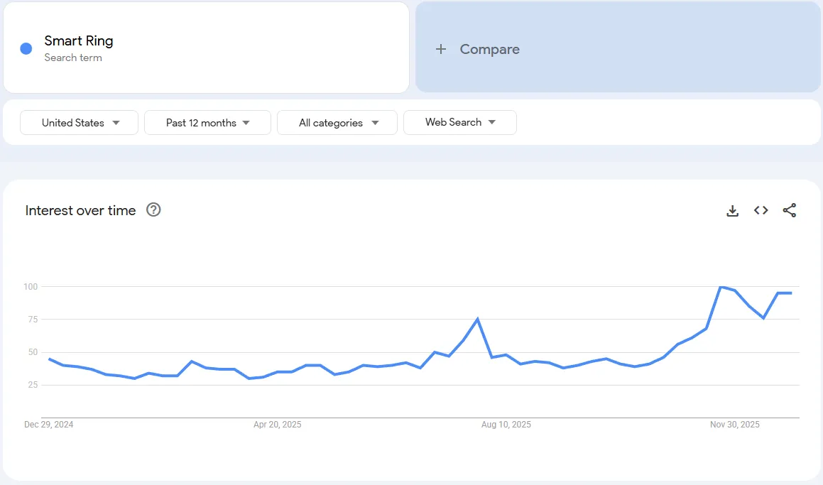 Nézd meg a fenti diagramot. Ez a "Samsung Ring" keresési mennyisége az elmúlt 90 napban. Látod azt a hatalmas kiugrást novemberben? Ez azt jelenti, hogy a Samsung dollármilliókat költ az oktatásra a te jövőbeli ügyfelek. Az Insight: A közvélemény most már tudja, mi az a Smart Ring. A legtöbb fogyasztó azonban nem hajlandó 399 dollárt fizetni. A keresési trend stabilizálódni kezd, ami azt jelenti, hogy a "hype fázis" véget ért, és megkezdődik a megfizethető opciók (50-80 dollár) "vásárlási fázisa".